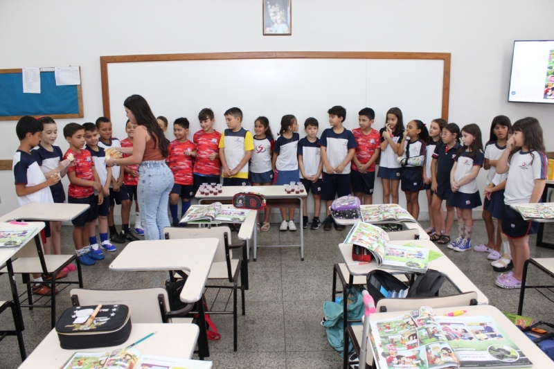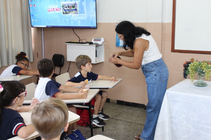 Alunos dos períodos da manhã e da tarde participaram de acolhidas especiais de Páscoa, marcadas por momentos simbólicos de partilha do pão e do suco, relembrando o gesto de Jesus como sinal de união, serviço e solidariedade.