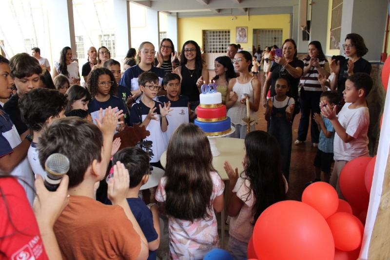Após as homenagens, a comunidade se reuniu na área vermelha da escola para cantar os parabéns e celebrar com o bolo comemorativo de 130 anos, em um momento de alegria e confraternização.