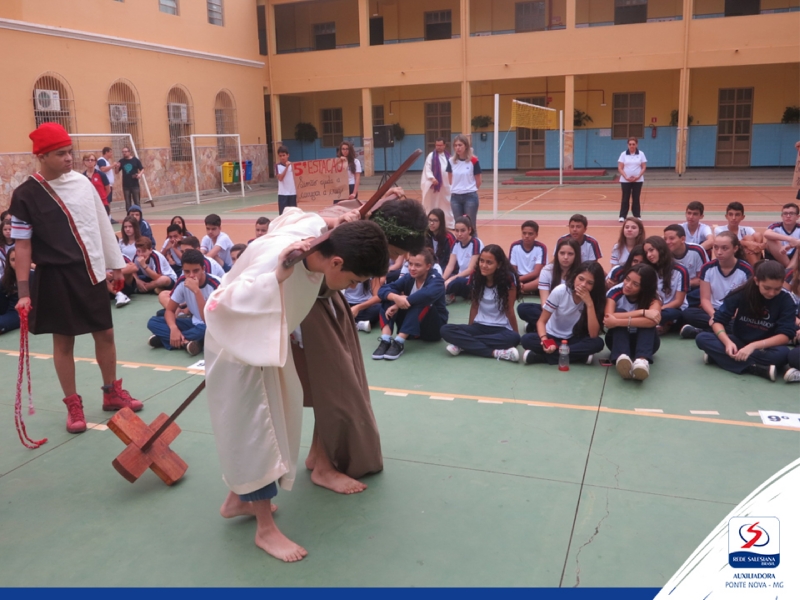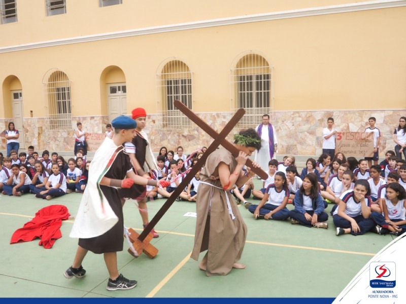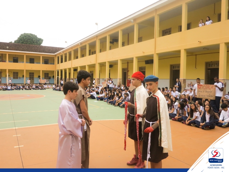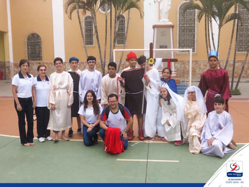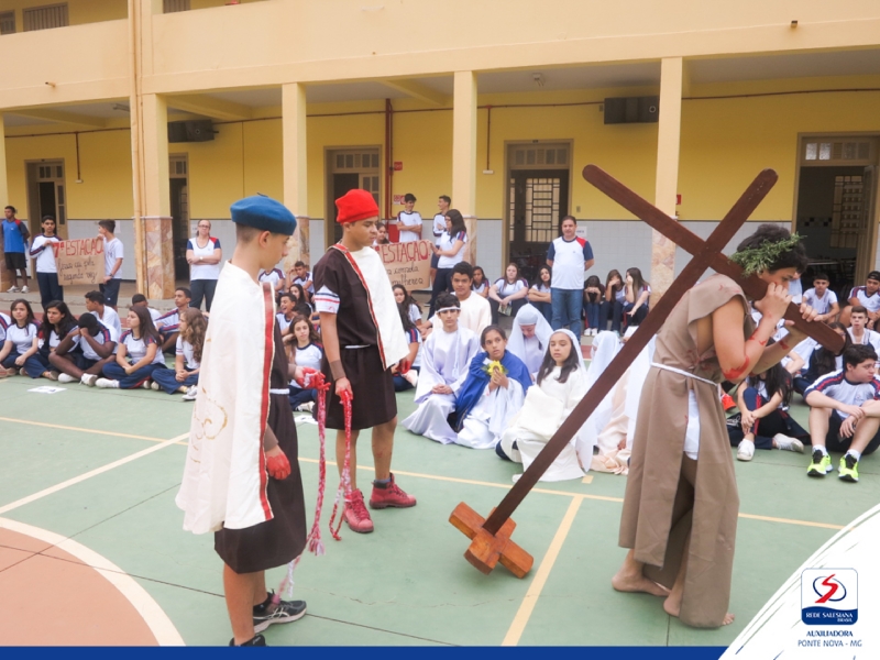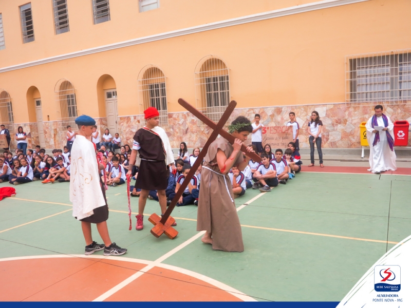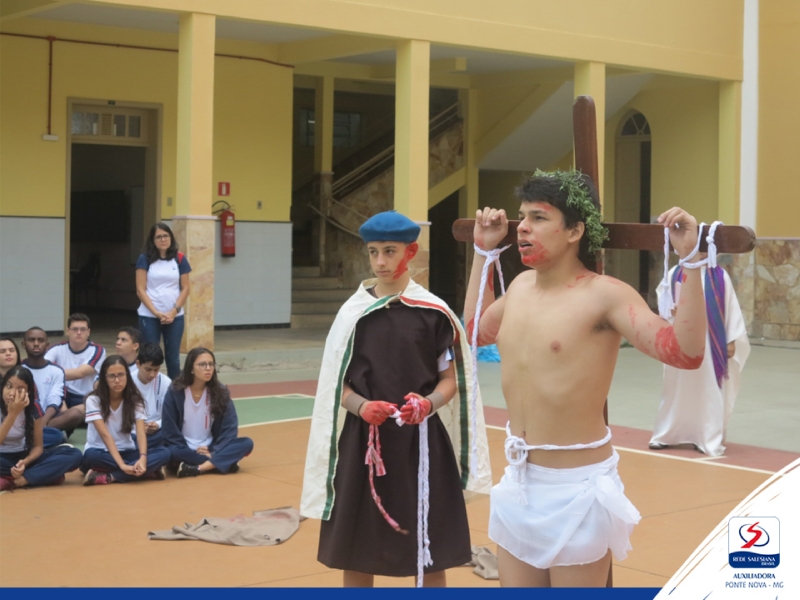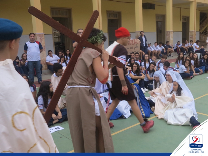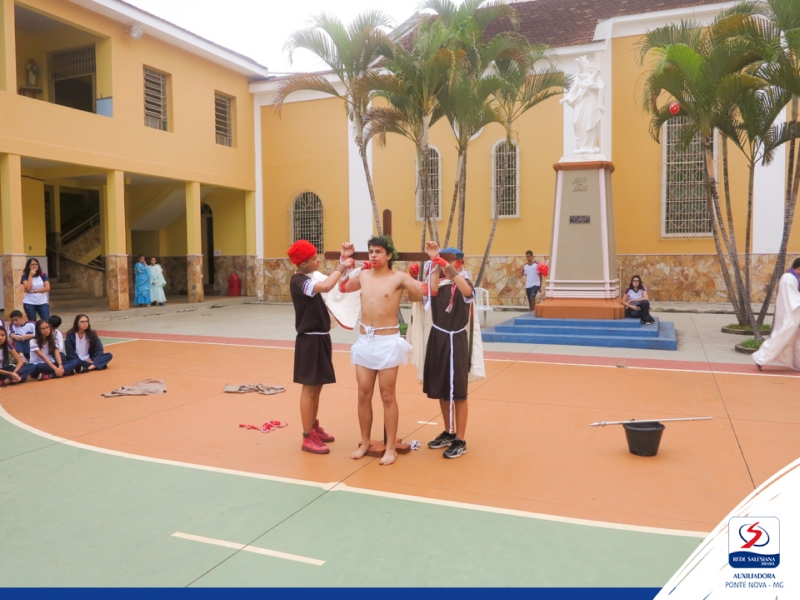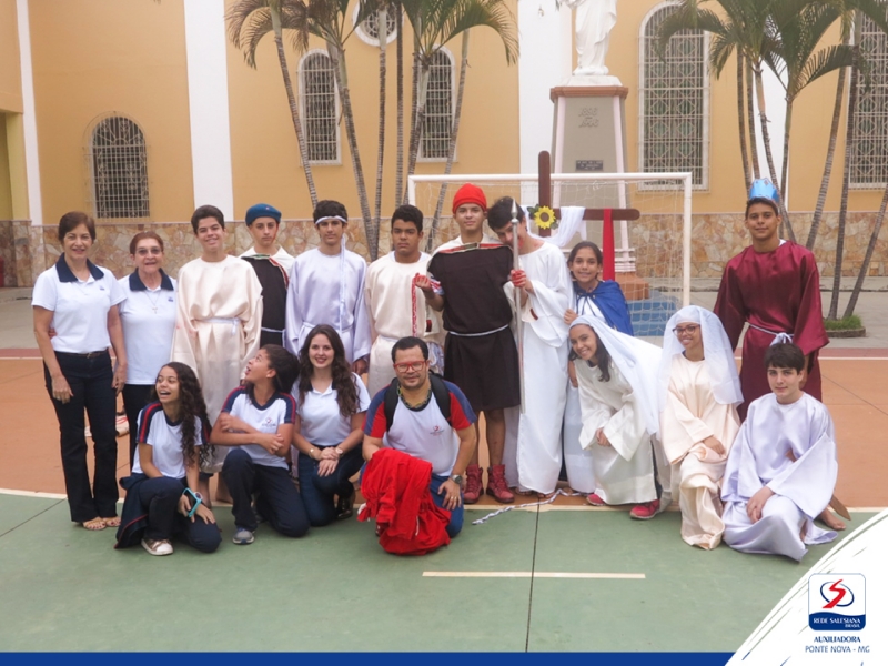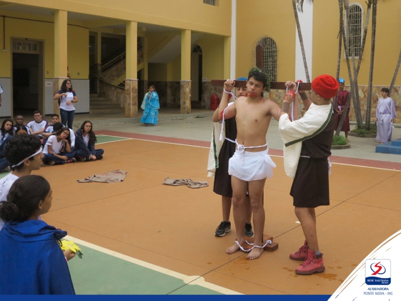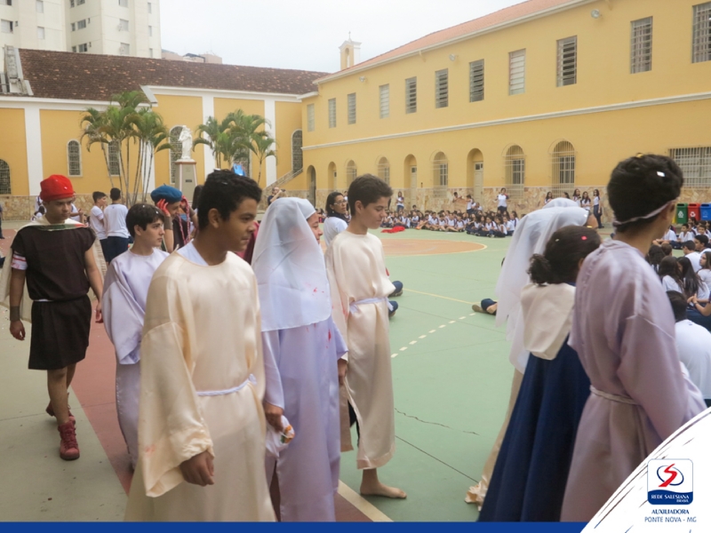 Celebramos nesta quarta-feira santa, 28/03, a Páscoa dos alunos do Ensino Fundamental II e Ensino Médio no turno da manhã com uma linda e emocionante encenação da Via Sacra e Ressurreição de Jesus. Os alunos que apresentaram fazem parte da oficina de teatro e do grupo da pastoral da escola. Sob a orientação dos professores Norando, Rivo e a coordenadora de pastoral, Diana, os alunos prepararam a celebração com muito carinho e dedicação. A encenação aconteceu logo no início da manhã, às 7h, no pátio central da escola, onde todos os outros alunos puderam acompanhar a trajetória de Jesus durante as estações que representaram sua prisão, flagelo, sofrimento, humilhação e morte. Celebrar a Paixão de Cristo é um dos momentos mais importantes para todo cristão, pois nela que está o sentido da nossa fé. Após celebrar a morte comemorarmos a ressurreição de Jesus como promessa de vida eterna. Assim, encerramos a encenação com um Jesus vivo, alegre desejando uma Feliz Páscoa para toda a comunidade educativa da Escola Nossa Senhora Auxiliadora.