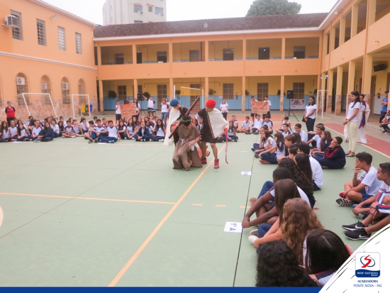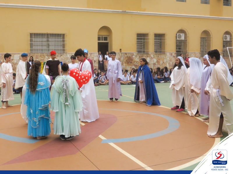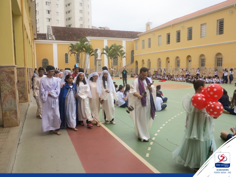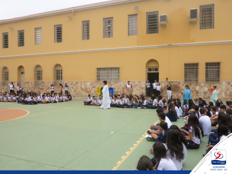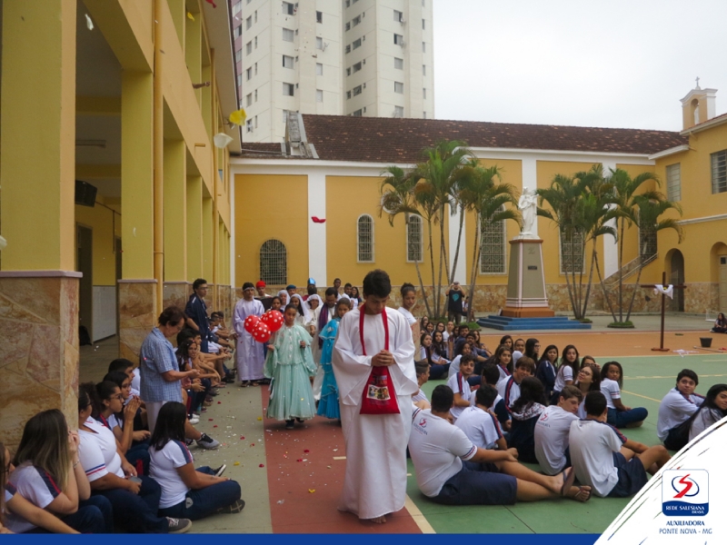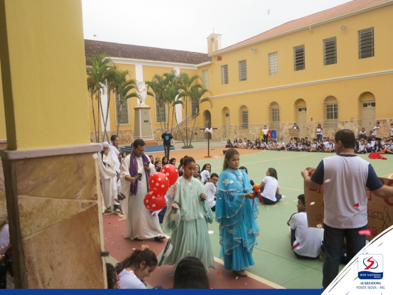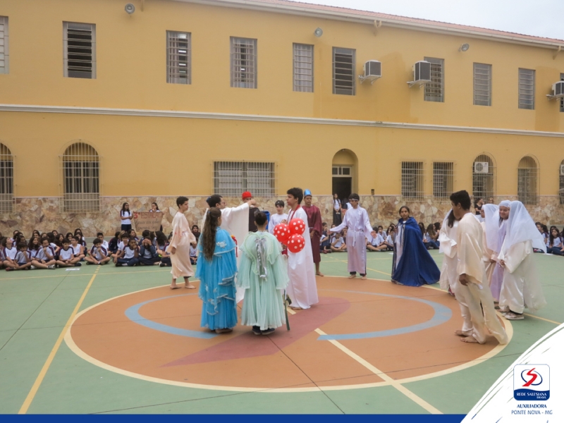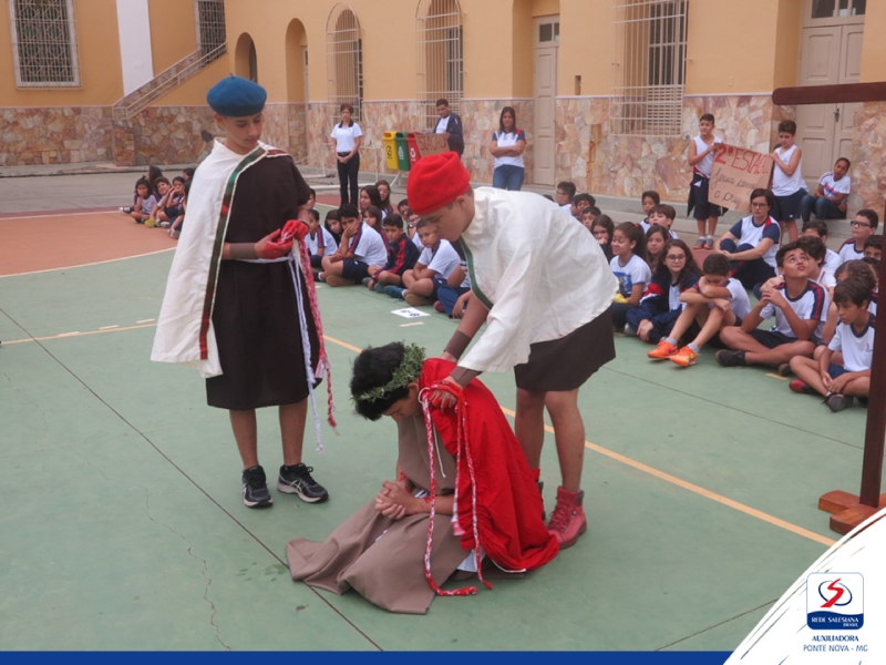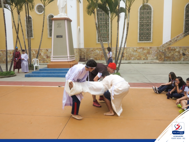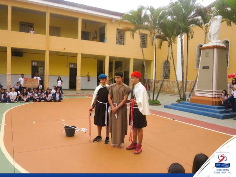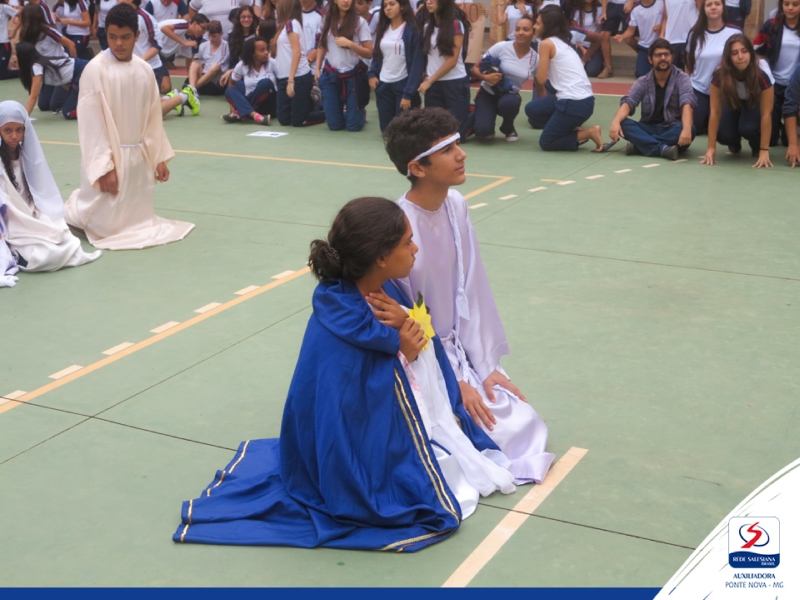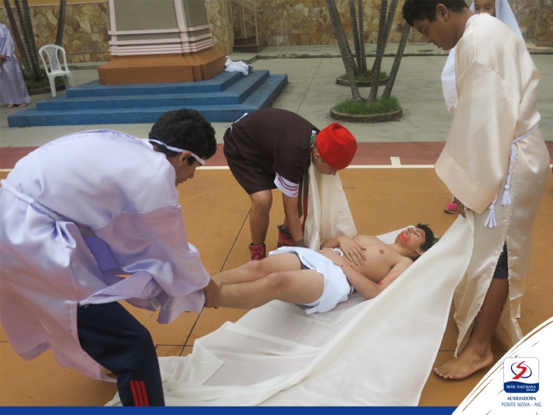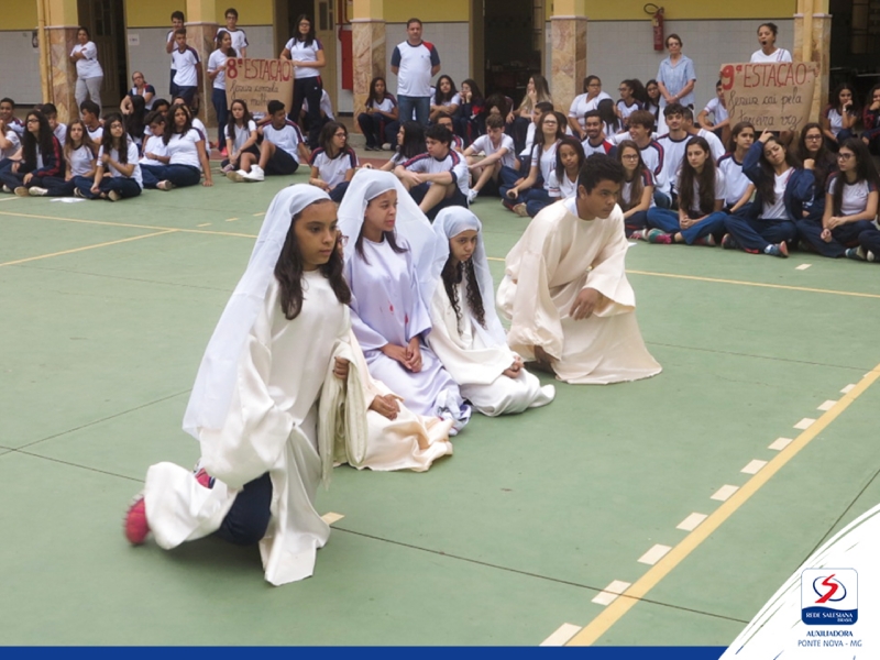 Celebramos nesta quarta-feira santa, 28/03, a Páscoa dos alunos do Ensino Fundamental II e Ensino Médio no turno da manhã com uma linda e emocionante encenação da Via Sacra e Ressurreição de Jesus. Os alunos que apresentaram fazem parte da oficina de teatro e do grupo da pastoral da escola. Sob a orientação dos professores Norando, Rivo e a coordenadora de pastoral, Diana, os alunos prepararam a celebração com muito carinho e dedicação. A encenação aconteceu logo no início da manhã, às 7h, no pátio central da escola, onde todos os outros alunos puderam acompanhar a trajetória de Jesus durante as estações que representaram sua prisão, flagelo, sofrimento, humilhação e morte. Celebrar a Paixão de Cristo é um dos momentos mais importantes para todo cristão, pois nela que está o sentido da nossa fé. Após celebrar a morte comemorarmos a ressurreição de Jesus como promessa de vida eterna. Assim, encerramos a encenação com um Jesus vivo, alegre desejando uma Feliz Páscoa para toda a comunidade educativa da Escola Nossa Senhora Auxiliadora.