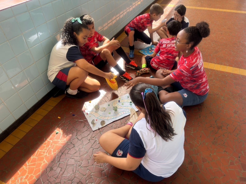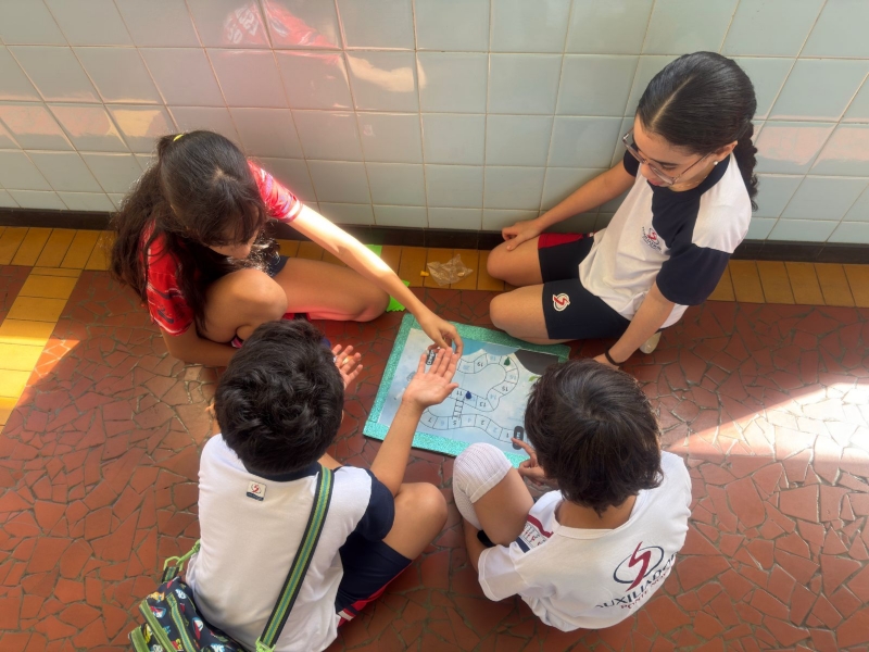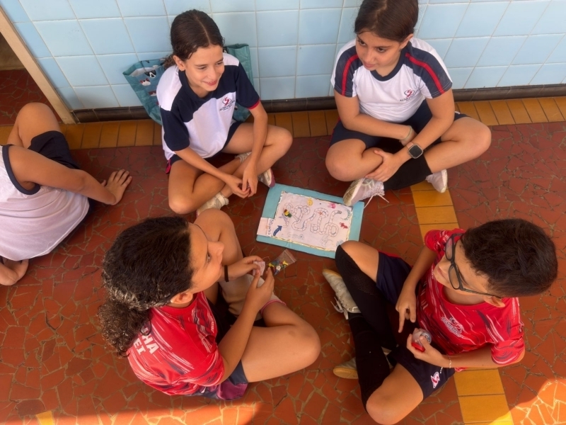 Durante as aulas de Língua Portuguesa, os alunos aprenderam sobre a importância de produzir instruções claras e objetivas, compreendendo como esse tipo de texto está presente no cotidiano, especialmente nas regras de jogos e brincadeiras. Após esse momento teórico, os estudantes foram desafiados a aplicar os conhecimentos em uma atividade prática e criativa: elaborar seus próprios jogos de tabuleiro em grupo.