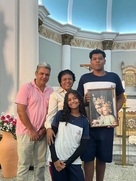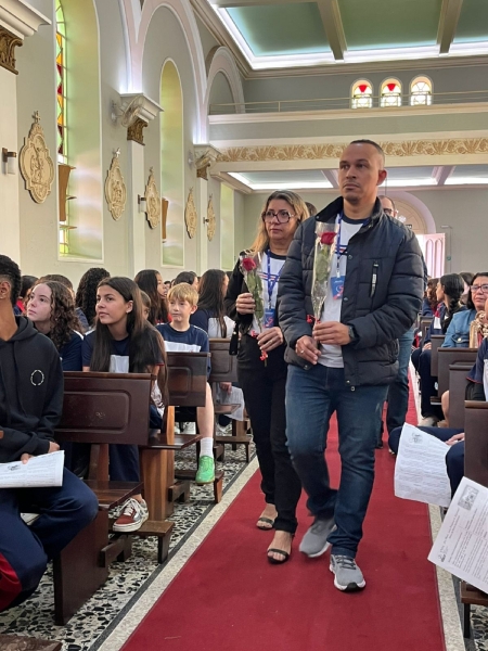 Outro gesto simbólico da manhã foi a entrega do quadro de Nossa Senhora Auxiliadora e da imagem da Sagrada Família às famílias que irão acolher esses símbolos sagrados em seus lares ao longo do ano de 2025. Esse gesto representa o compromisso da escola em manter viva a espiritualidade salesiana também no ambiente familiar.