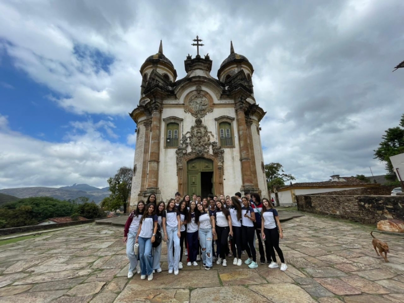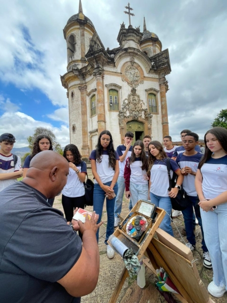 Durante a visita, os alunos exploraram importantes pontos históricos, como o Museu da Inconfidência e as igrejas de São Francisco e do Pilar, reconhecendo nas obras e construções os traços marcantes das manifestações culturais e estéticas de cada período.