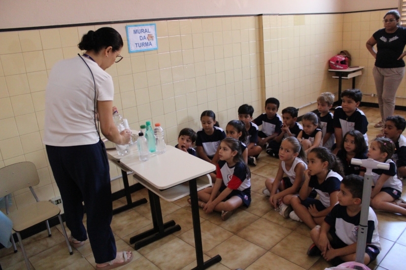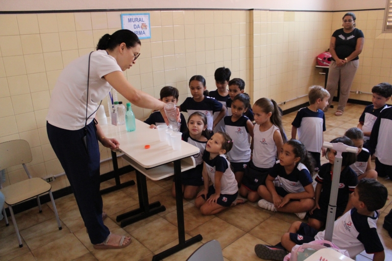 Os alunos do 1º Ano A participaram de uma aula prática de Matemática que explorou, de forma simples e divertida, o conceito de comparação de capacidade.