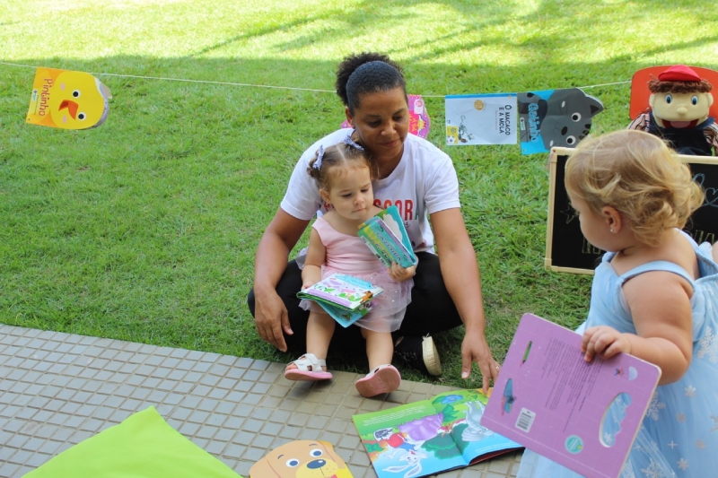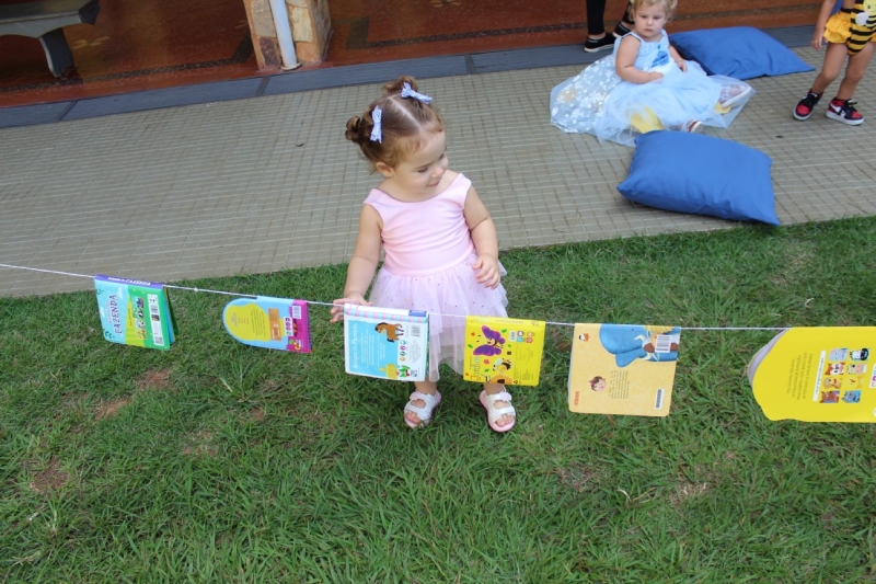 Na sequência, os pequenos participaram de um momento de exploração no varal de livros, onde puderam manusear as histórias de forma livre e divertida, fortalecendo o vínculo com a leitura desde cedo.
