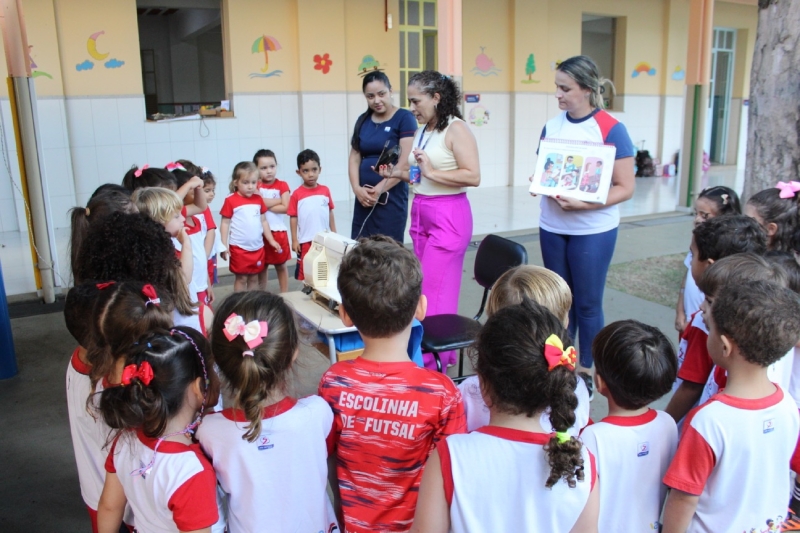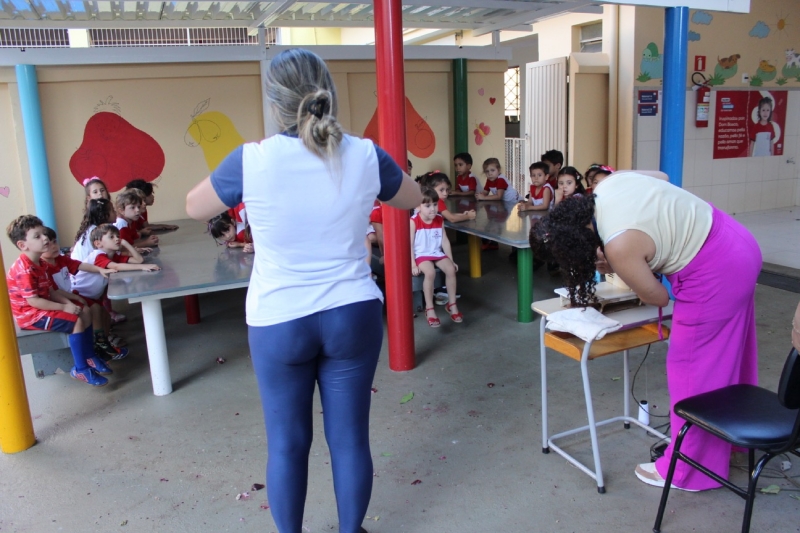 A participação dos alunos foi marcada por interação e envolvimento. As crianças acompanharam atentamente a apresentação, fizeram perguntas e observaram os detalhes do trabalho apresentado, reforçando o aprendizado construído previamente com as professoras.