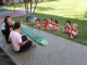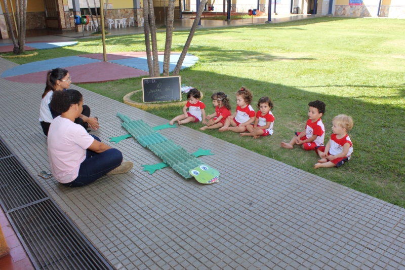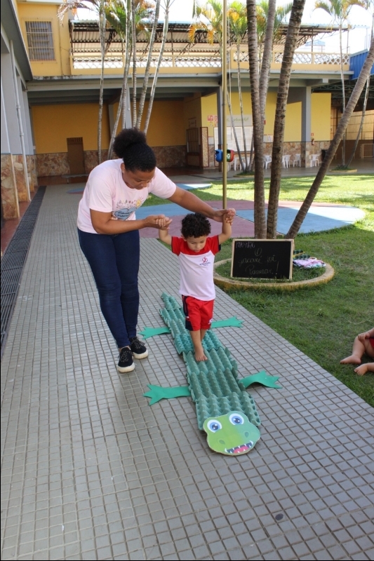 Na sequência, os pequenos foram convidados a explorar o movimento corporal ao caminhar sobre um jacaré confeccionado com caixa de ovos. A proposta, além de despertar o interesse e a curiosidade, contribuiu para o desenvolvimento do equilíbrio e da coordenação motora, aspectos fundamentais nessa fase da infância.