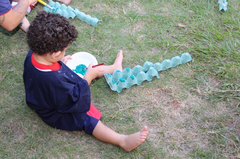 Para encerrar, cada criança teve a oportunidade de pintar seu próprio jacaré, também produzido com caixa de ovos. A atividade artística estimulou a criatividade, a autonomia e a expressão individual, permitindo que cada aluno deixasse sua marca de forma única.