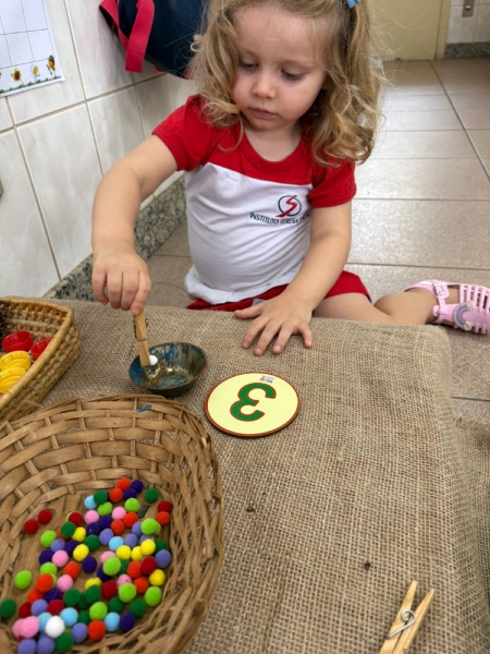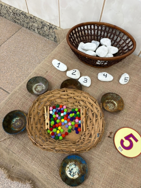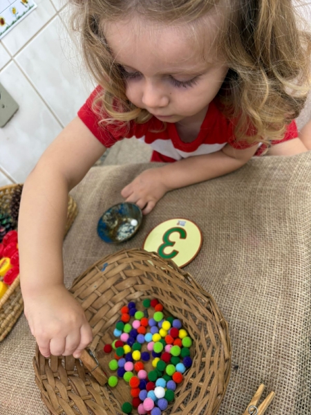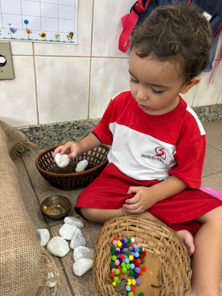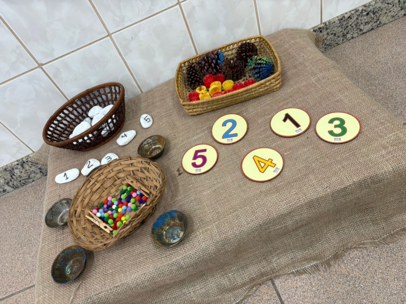 Propostas como as realizadas com cestos, pinhas, tampinhas, pompons, pedras numeradas e potinhos são excelentes exemplos de vivências significativas, pois convidam a criança a manipular, investigar e construir hipóteses. Ao explorar elementos naturais e materiais não estruturados, a criança desenvolve noções matemáticas de forma intuitiva. Por exemplo, ao colocar pompons em recipientes, pode experimentar ideias de “muito” e “pouco”.