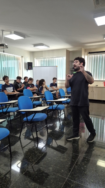 A mediação ficou por conta do professor Lucas Garcia, que conduziu o debate de forma dinâmica e participativa. O encontro também contou com a presença dos professores convidados Carlos, da área de Geografia, e João Lucas, de História, que contribuíram com diferentes abordagens e contextualizações sobre o tema.