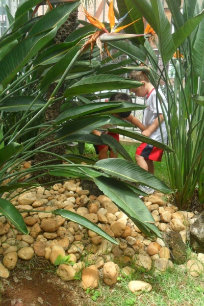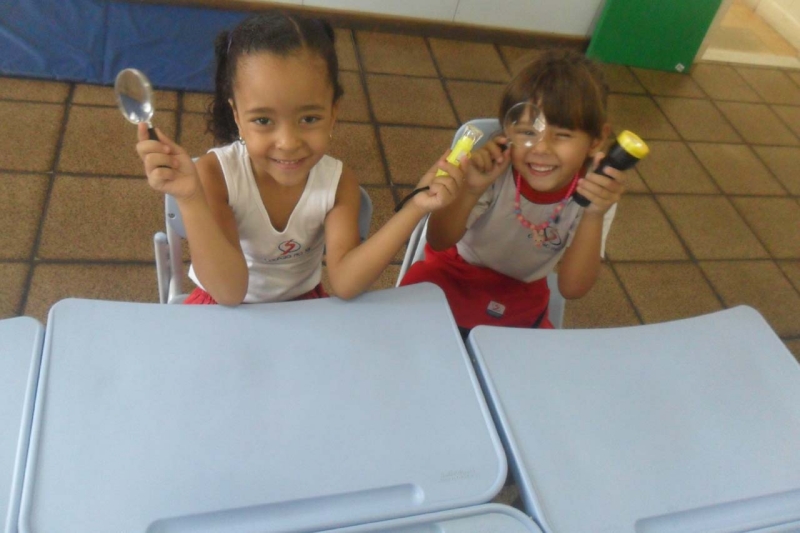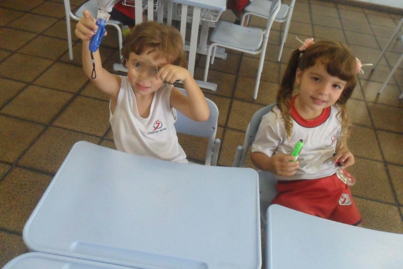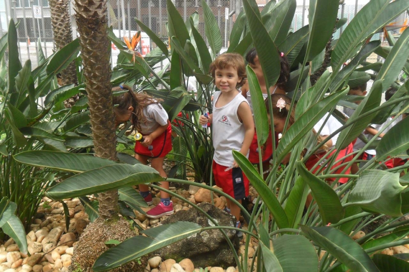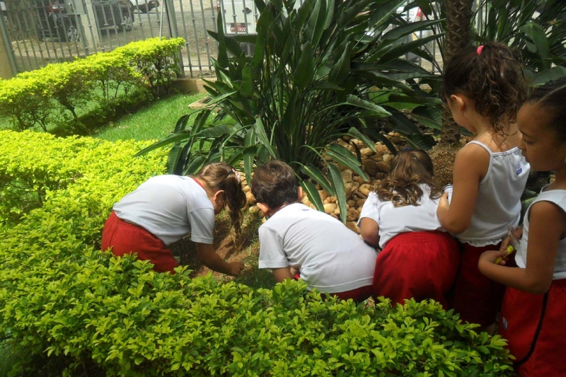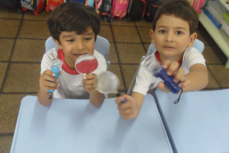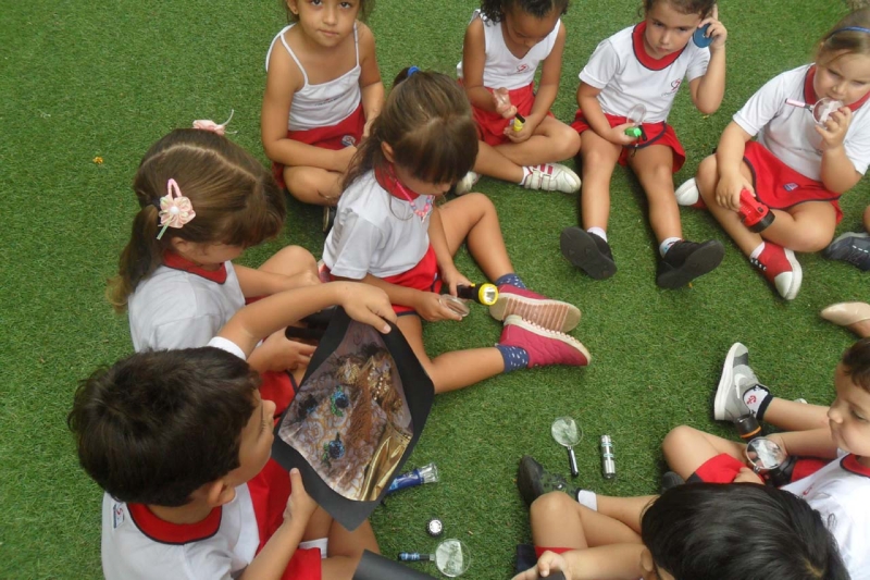 Com uma lupa e uma lanterna, os estudantes do Infantil II realizaram uma atividade inédita: encontraram no jardim do Colégio uma Cápsula do Tempo com cartas, músicas, estilos de roupas, fotos e recordações de Chiquinha Gonzaga.