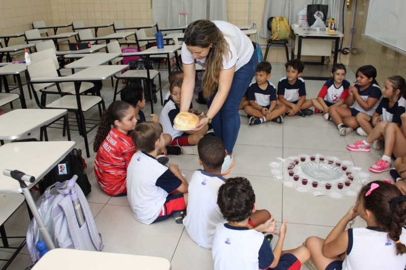 Alunos dos períodos da manhã e da tarde participaram de acolhidas especiais de Páscoa, marcadas por momentos simbólicos de partilha do pão e do suco, relembrando o gesto de Jesus como sinal de união, serviço e solidariedade.