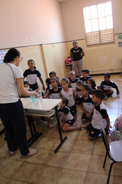Os alunos do 1º Ano A participaram de uma aula prática de Matemática que explorou, de forma simples e divertida, o conceito de comparação de capacidade.