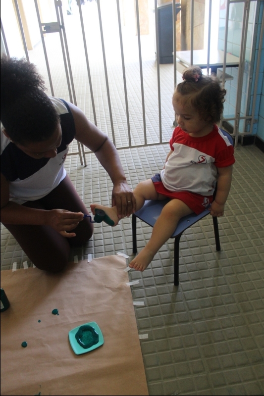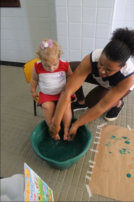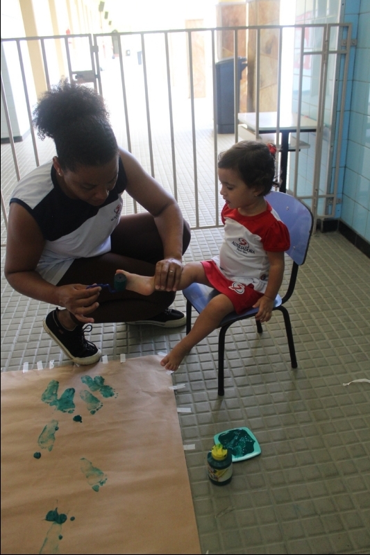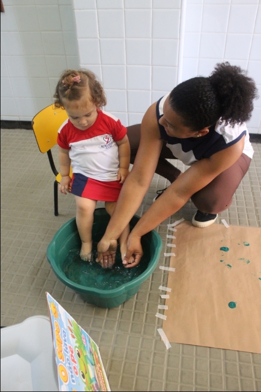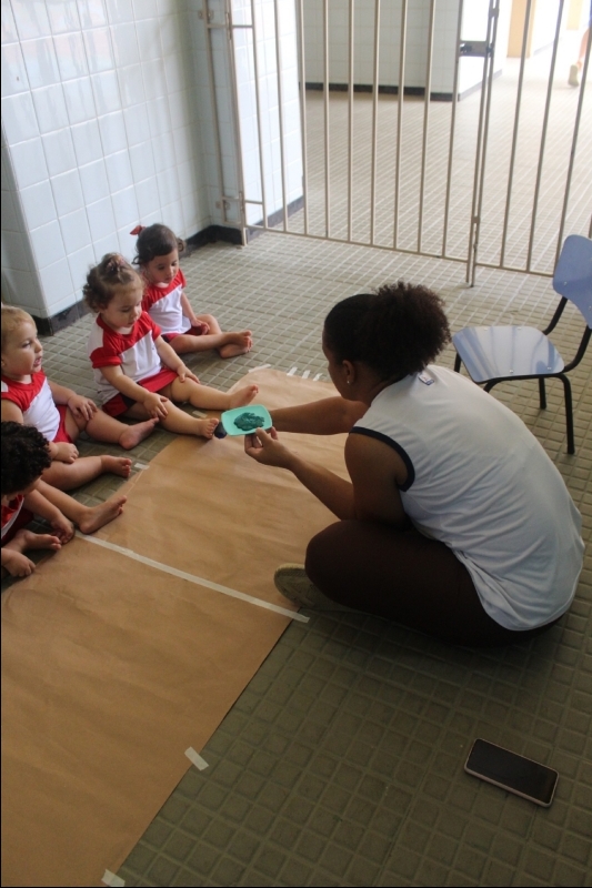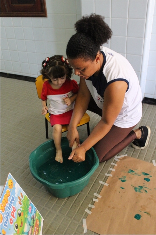 Na sequência, os pequenos carimbaram seus pezinhos com tinta verde, transformando a atividade em uma experiência criativa e cheia de descobertas. Depois, participaram de uma dinâmica de lavagem dos pés de maneira lúdica, reforçando a importância dos cuidados com a higiene no dia a dia.