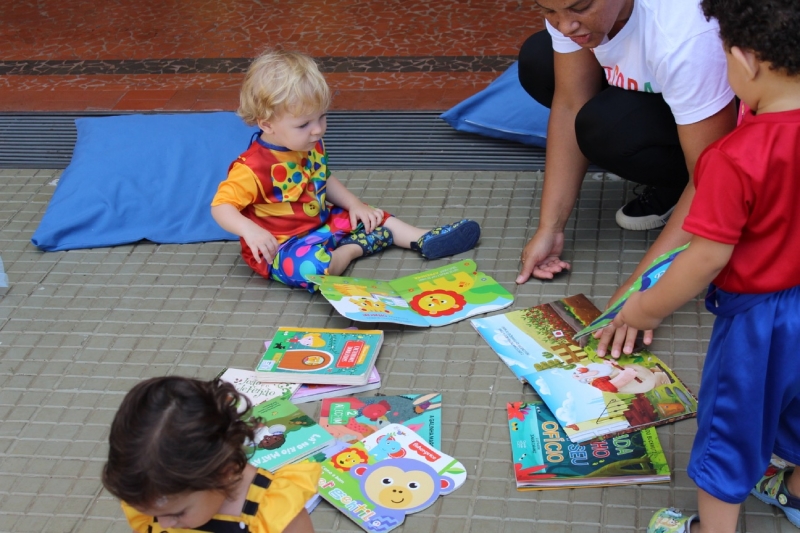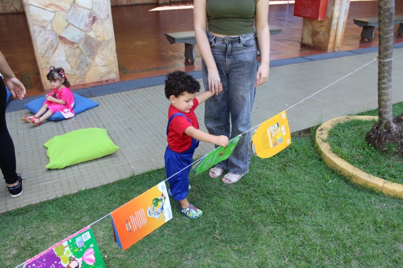 Na sequência, os pequenos participaram de um momento de exploração no varal de livros, onde puderam manusear as histórias de forma livre e divertida, fortalecendo o vínculo com a leitura desde cedo.