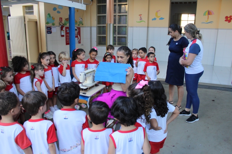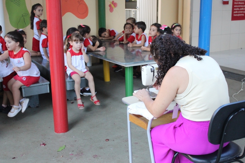Os alunos da Educação Infantil participaram, na semana passada, de uma atividade especial dentro da proposta pedagógica que aborda os profissionais da moda. A ação contou com a presença de Giovana, costureira convidada pela escola, que apresentou às crianças aspectos do seu trabalho e do processo de criação de peças.