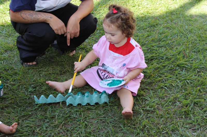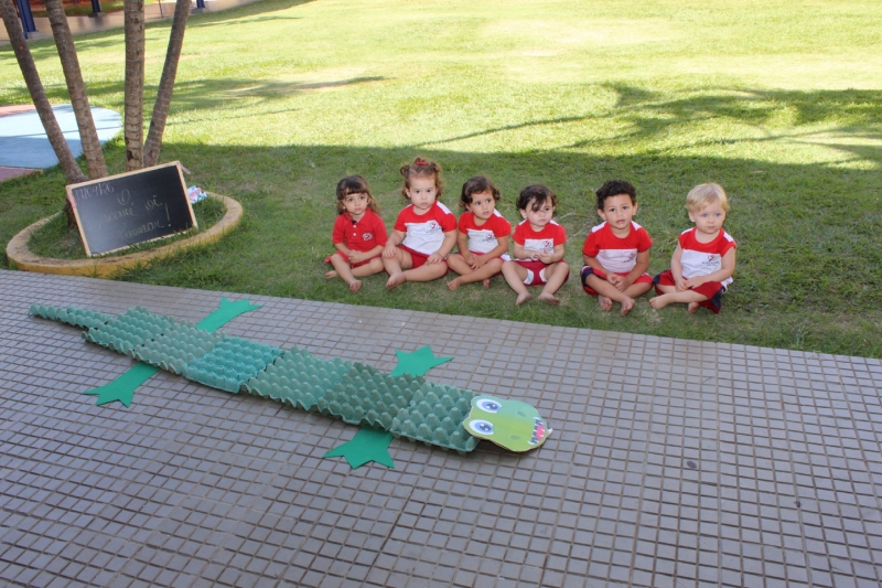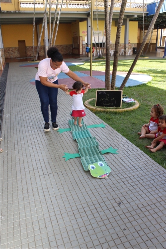 Na sequência, os pequenos foram convidados a explorar o movimento corporal ao caminhar sobre um jacaré confeccionado com caixa de ovos. A proposta, além de despertar o interesse e a curiosidade, contribuiu para o desenvolvimento do equilíbrio e da coordenação motora, aspectos fundamentais nessa fase da infância.