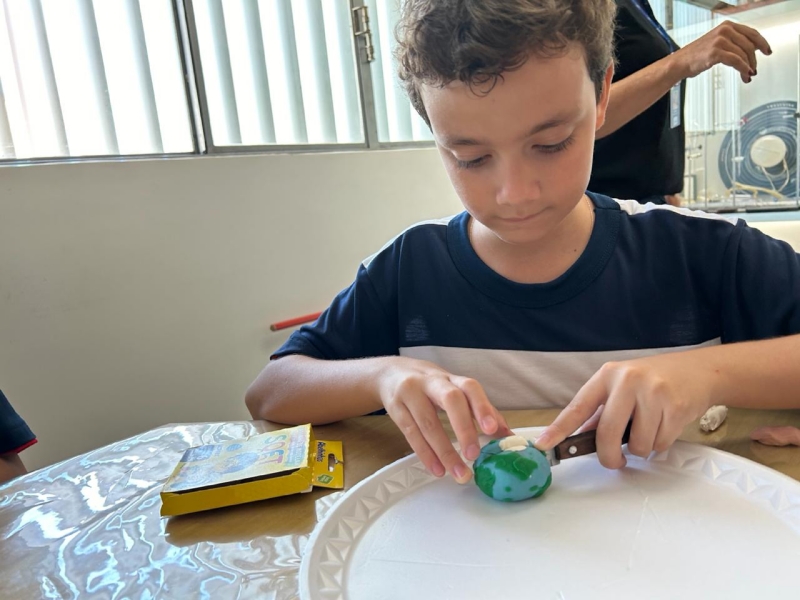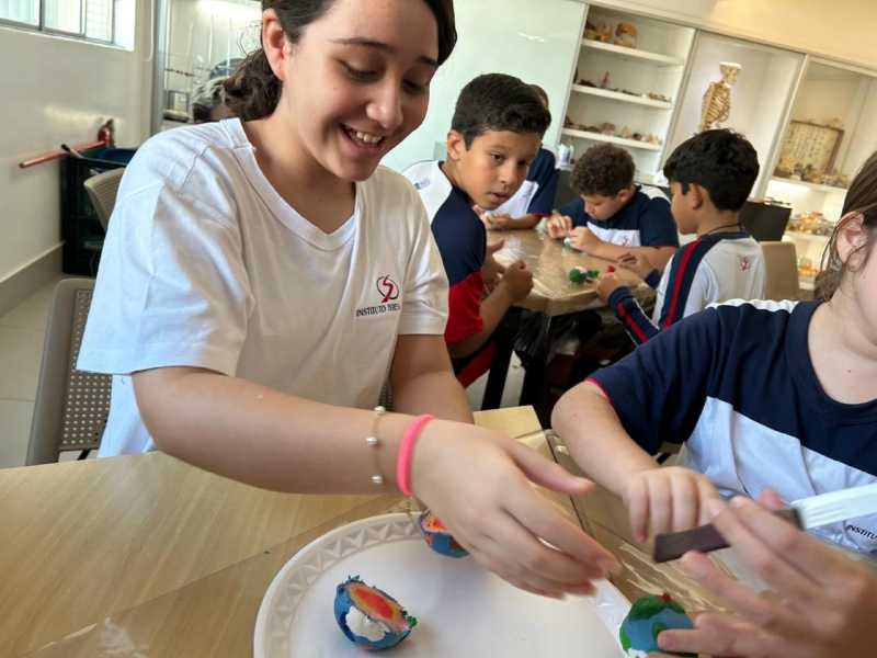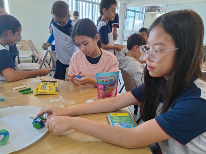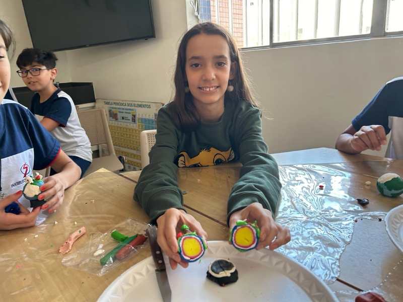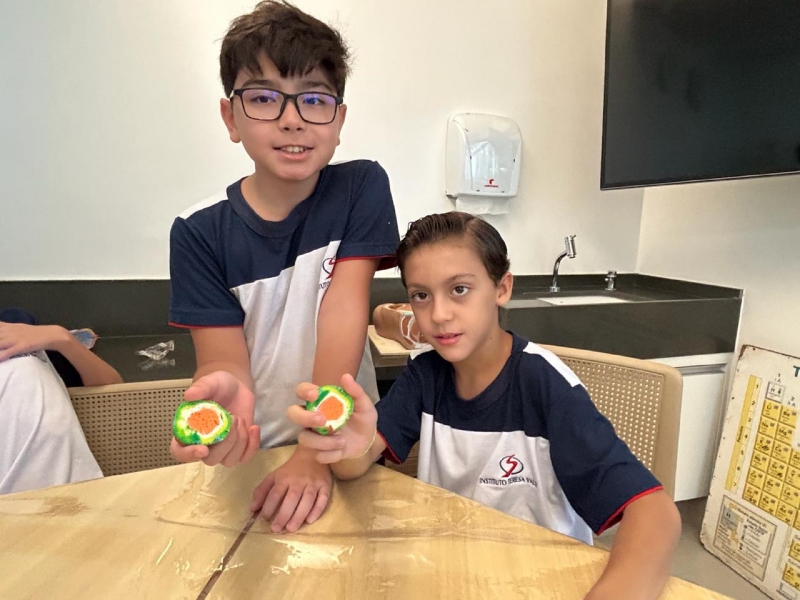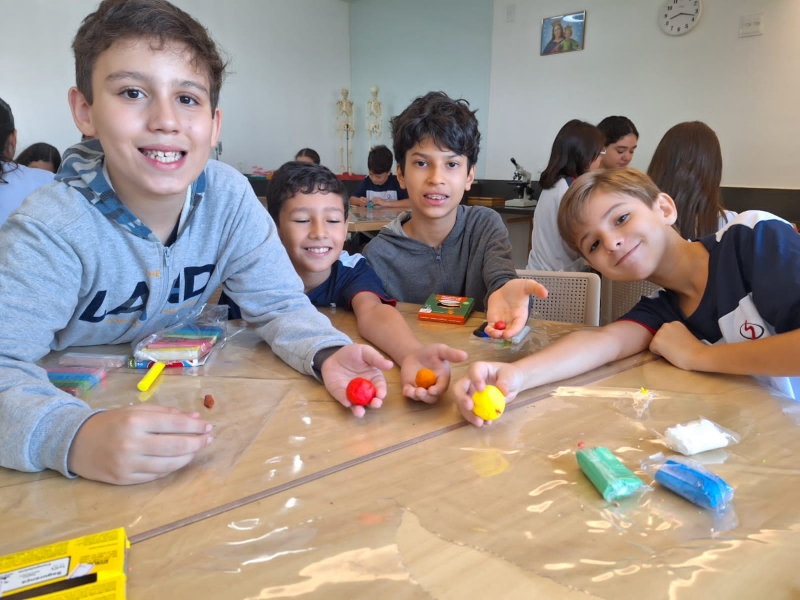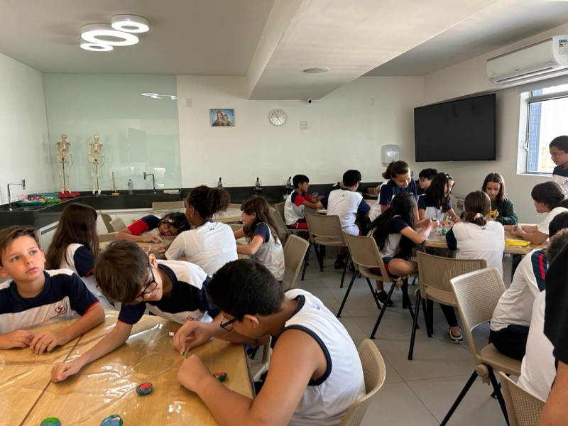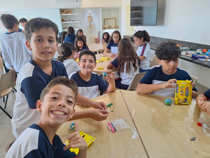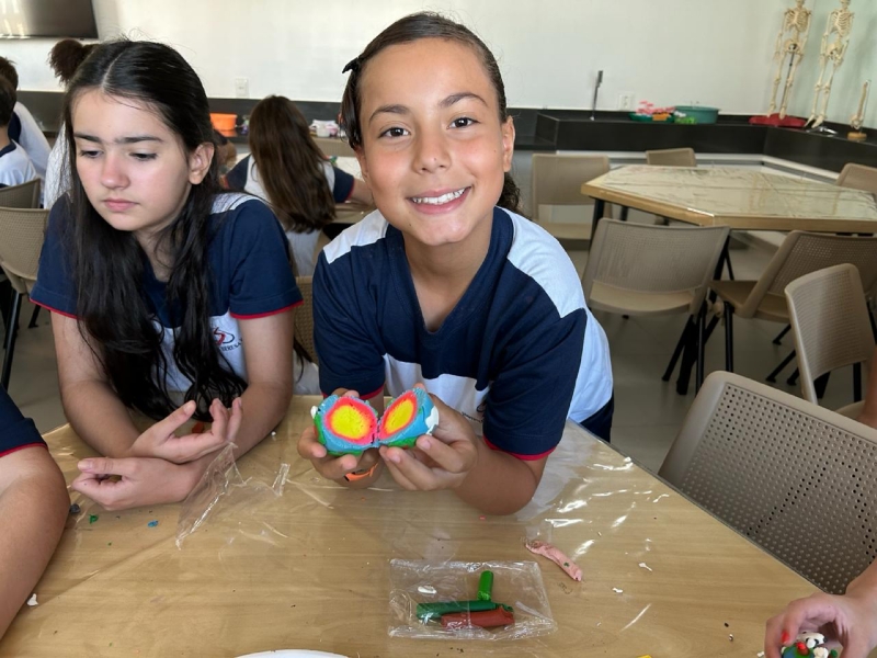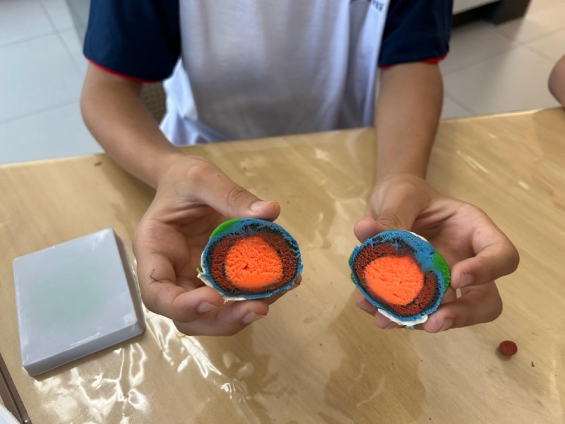 Nas aulas de Ciências, os estudantes do 6º ano do Ensino Fundamental colocaram a mão na massa, explorando o laboratório de Ciências e utilizando massinha de modelar colorida para moldar e construir as camadas internas do planeta Terra: núcleos interno e externo, manto e crosta terrestre.